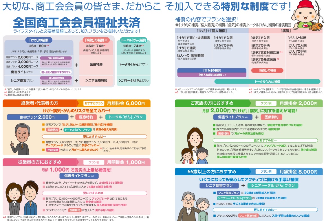 けが、病気、さらにはがんまで幅広く補償し、また、もしもの時の生命の保障まで「商工会会員の皆様だけがご加入いただける特別な制度」です。