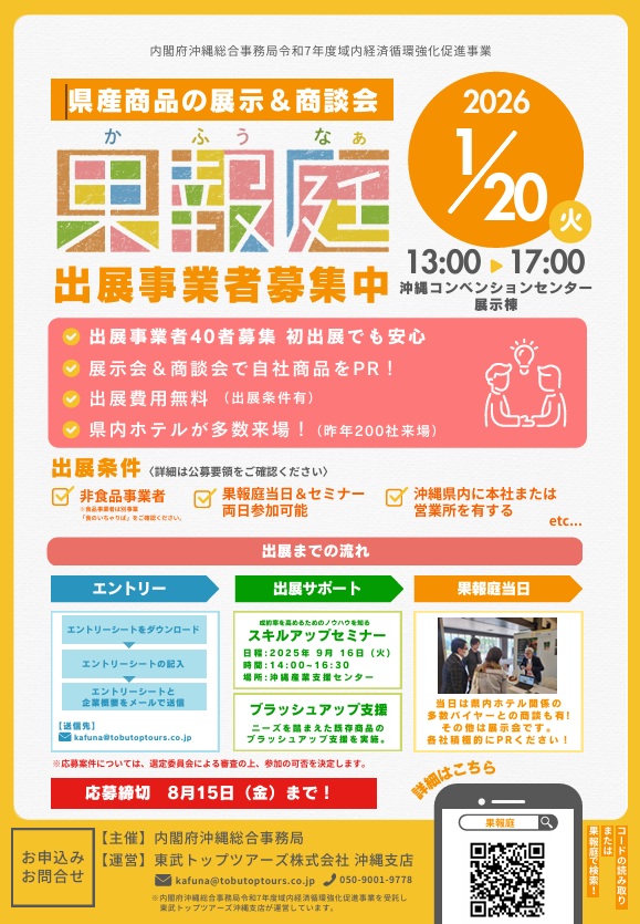 令和7年度果報庭の開催にあたり、出展事業者(沖縄県内サプライヤー(食品・飲料品を除く※一部例外あり。))を募集します。販路開拓に意欲のある事業者のご応募をお待ちしております。