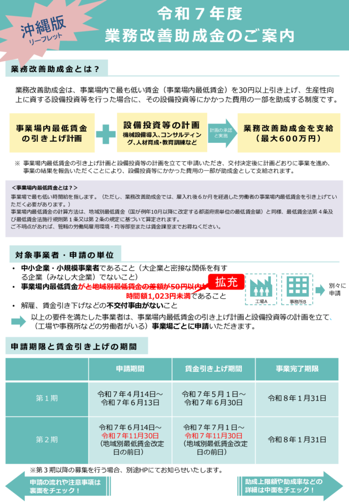 令和7年度沖縄県最低賃金の改正について おしらせ 2025-09-29 沖縄労働局より令和7年12月1日から沖縄県の最低賃金は1,023円に改正されます。改正に伴い周知依頼がございましたのでお知らせします。 また、中小企業・小規模事業者に対する最低賃金引上げ等に向けた環境整備のための各種支援策がありますのでご活用いただけますようお願いいたします。 ご不明な点等がありましたら、竹富町商工会へご連絡ください。 竹富町商工会 Tel:0980-82-5616